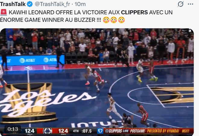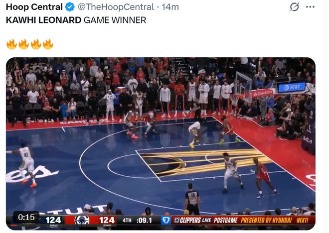 “莱昂纳德在比赛最后一秒送出一记惊天压哨两分,助快船队赢得胜利”。