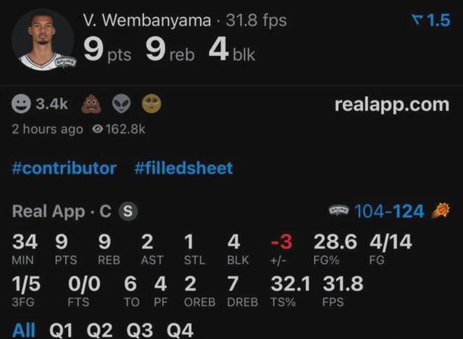 唯一的好消息是,马刺现在的战绩依旧跟文班亚马的表现呈现正相关:没有了主心骨的发挥,马刺被太阳全场压制。